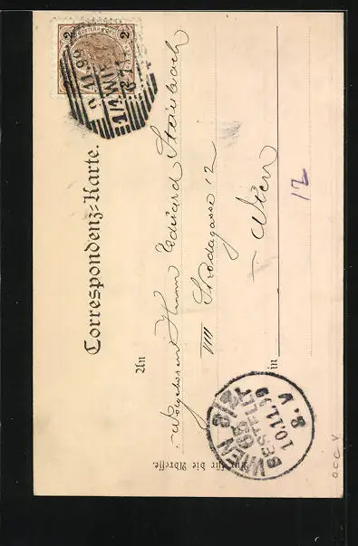 Personenbezogene Daten auf der Rückseite der Karte wurden durch blauen Textmarker unkenntlich gemacht. Die blauen Stellen sind auf die Vorderseite durchgeweicht und wirken sich negativ auf das Postkartenfoto aus