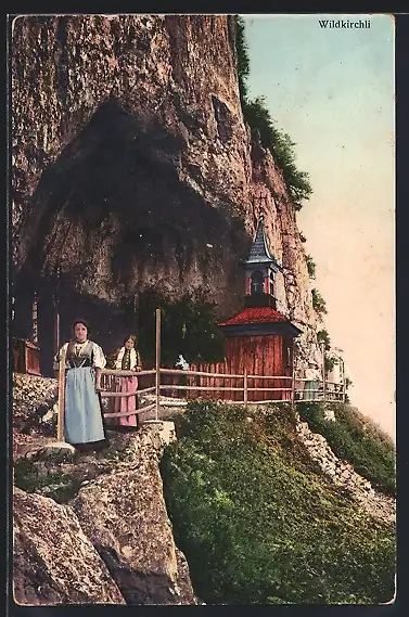 AK Wildkirchli, Zwei Frauen in Tracht vor der Kapelle
