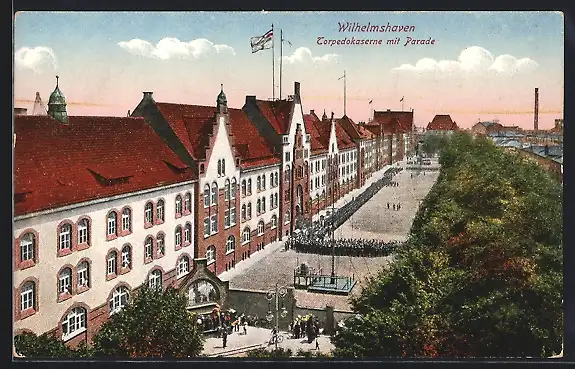 AK Wilhelmshaven, Blick über die Torpedokaserne mit Parade