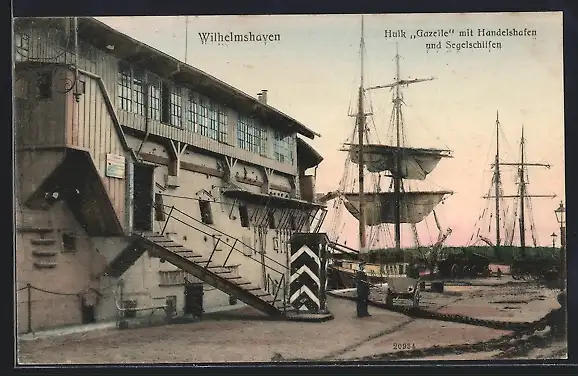 AK Wilhelmshaven, Hulk Gazelle mit Handelshafen und Segelschiffen