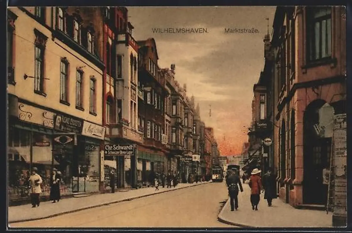 AK Wilhelmshaven, Partie an der Marktstrasse mit Schweizer Uhren-Lager von Chr. Schwardt