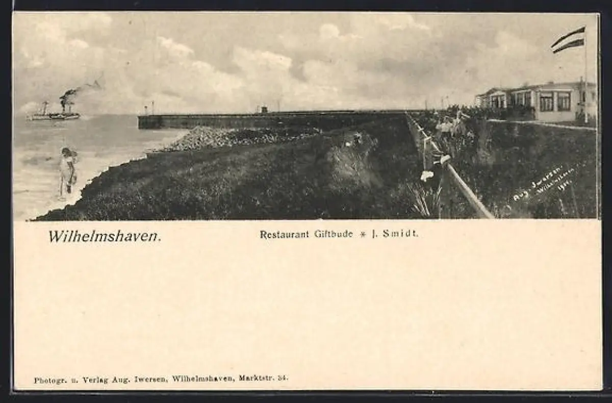 AK Wilhelmshaven, Restaurant Giftbude, J. Smidt, Raddampfer auf der Jademündung