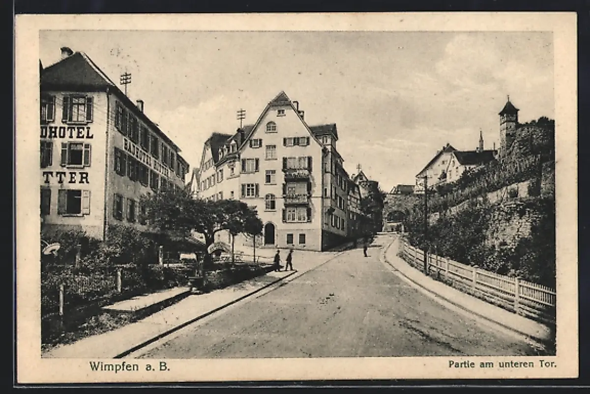 AK Wimpfen a. B., Strassenpartie am unteren Tor mit Hotel