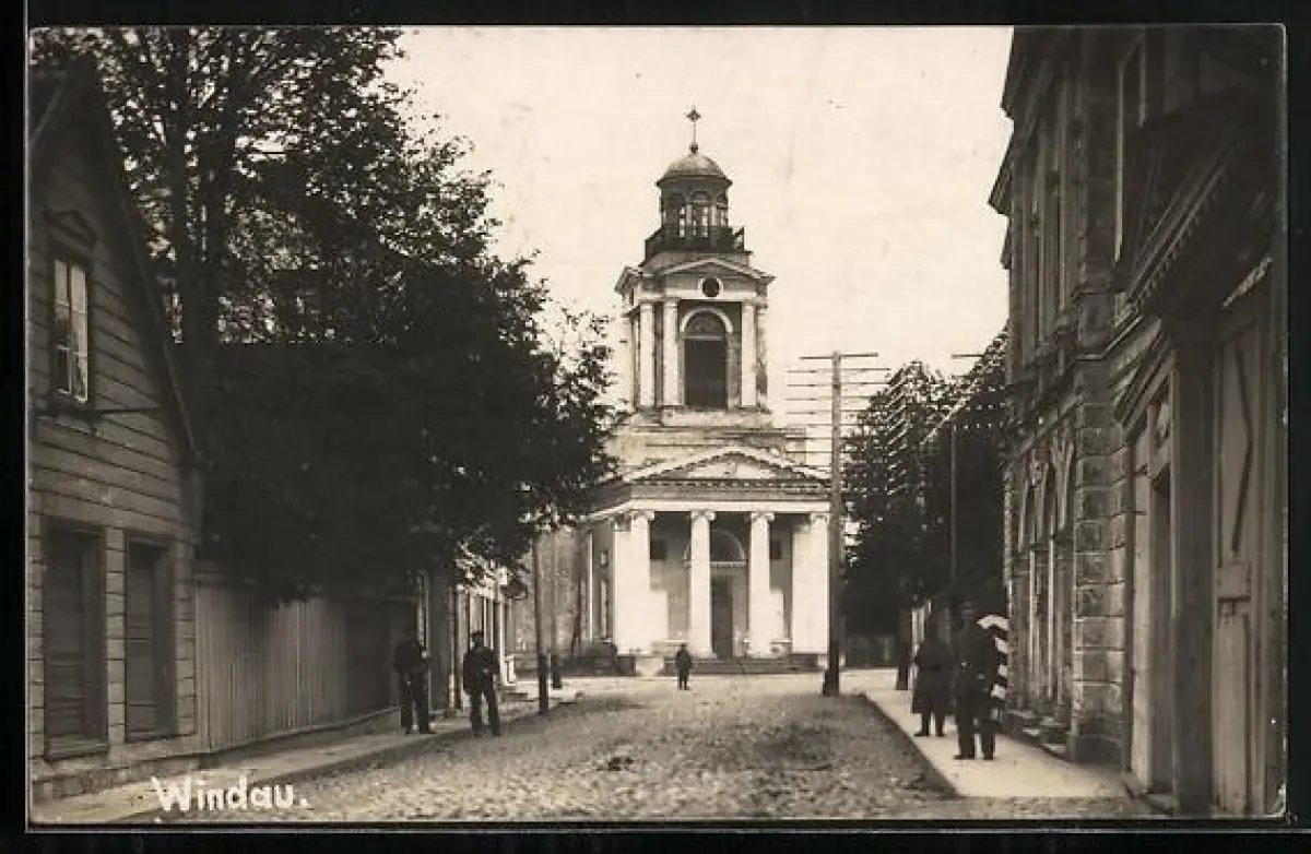 AK Windau, Strassenpartie mit Kirche