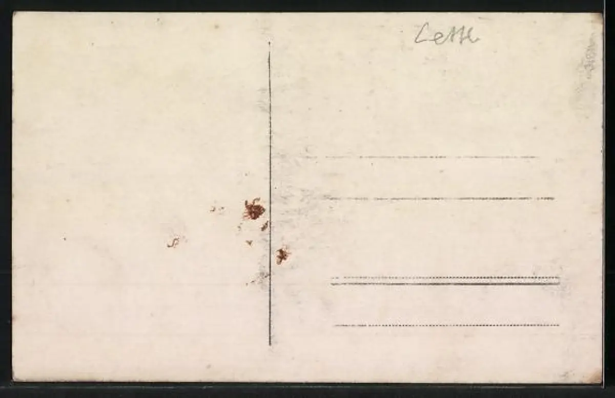 Personenbezogene Daten auf der Rückseite der Karte wurden durch blauen Textmarker unkenntlich gemacht. Die blauen Stellen sind auf die Vorderseite durchgeweicht und wirken sich negativ auf das Postkartenfoto aus