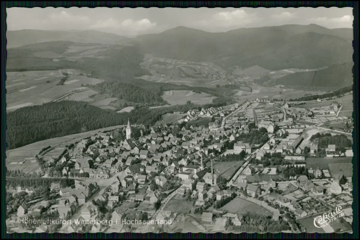 Diese Postkarte zeigt Winterberg vermutlich in den 1950er oder frühen 1960er Jahren, erkennbar an der Struktur und Bebauung sowie dem verwendeten Druckverfahren.