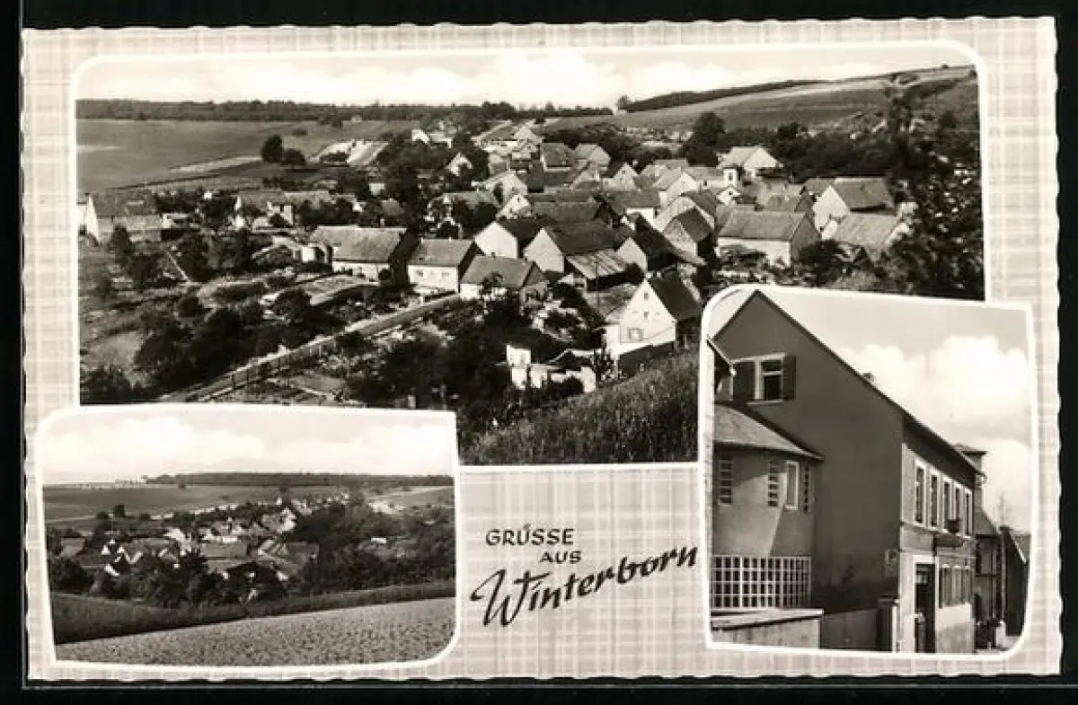 AK Winterborn, Gasthaus und Bäckerei Schneider-Schrick, Ortsansicht aus der Vogelschau