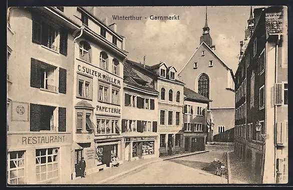 AK Winterthur, Garnmarkt mit Restaurant und Papeterie C. Sulzer-Müller