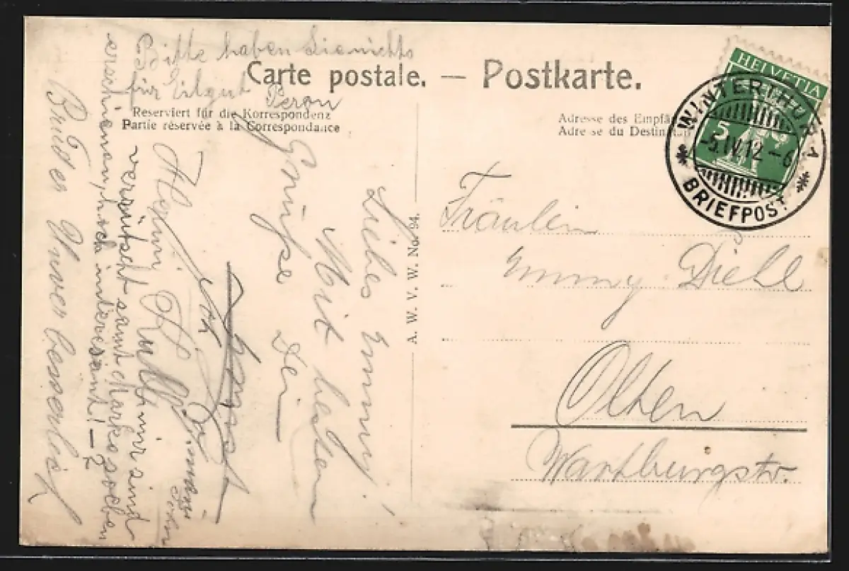gelaufen 1912, Eckknicke li. oben u. re. unten, Stempelspur, guter Zustand