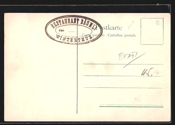 Personenbezogene Daten auf der Rückseite der Karte wurden durch blauen Textmarker unkenntlich gemacht. Die blauen Stellen sind auf die Vorderseite durchgeweicht und wirken sich negativ auf das Postkartenfoto aus