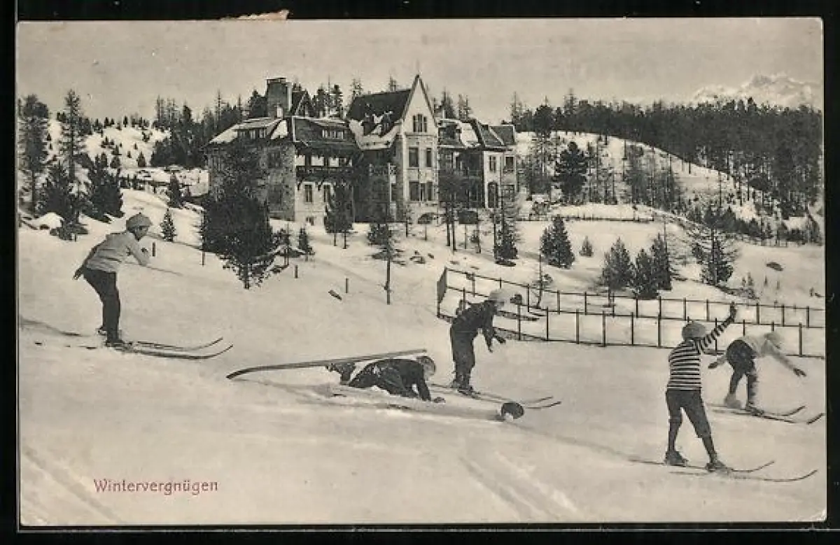 AK Wintervergnügen, Kleine Skiläufer vor einem Gebäude