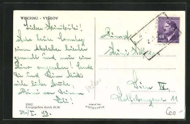 Personenbezogene Daten auf der Rückseite der Karte wurden durch blauen Textmarker unkenntlich gemacht. Die blauen Stellen sind auf die Vorderseite durchgeweicht und wirken sich negativ auf das Postkartenfoto aus
