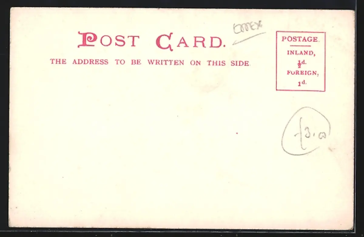 Personenbezogene Daten auf der Rückseite der Karte wurden durch blauen Textmarker unkenntlich gemacht. Die blauen Stellen sind auf die Vorderseite durchgeweicht und wirken sich negativ auf das Postkartenfoto aus
