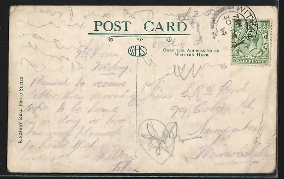 Personenbezogene Daten auf der Rückseite der Karte wurden durch blauen Textmarker unkenntlich gemacht. Die blauen Stellen sind auf die Vorderseite durchgeweicht und wirken sich negativ auf das Postkartenfoto aus