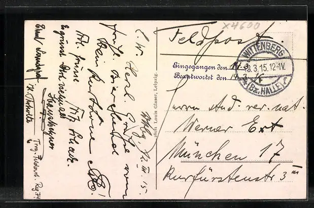 alte Ansichtskarte, gelaufen 1915 als Feldpost, Eckknicke oben, Stempelspur, guter Zustand