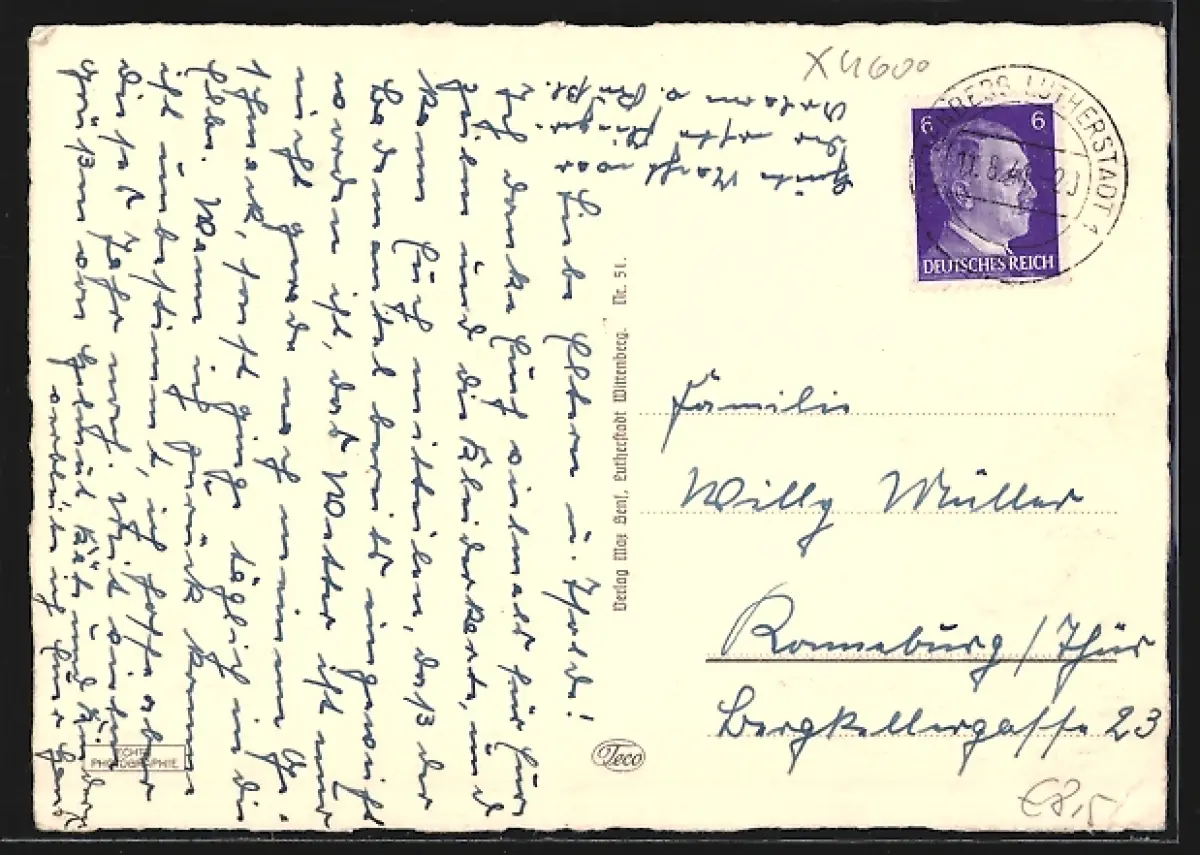 Personenbezogene Daten auf der Rückseite der Karte wurden durch blauen Textmarker unkenntlich gemacht. Die blauen Stellen sind auf die Vorderseite durchgeweicht und wirken sich negativ auf das Postkartenfoto aus