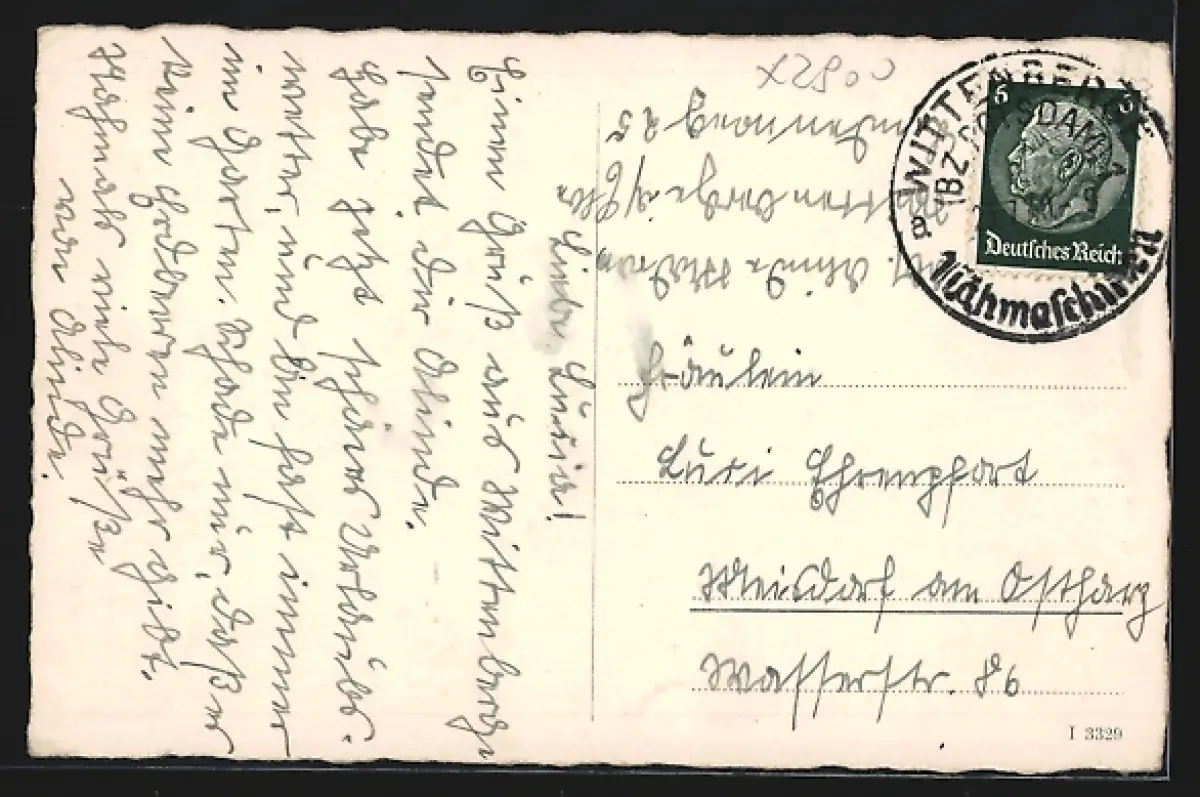 Personenbezogene Daten auf der Rückseite der Karte wurden durch blauen Textmarker unkenntlich gemacht. Die blauen Stellen sind auf die Vorderseite durchgeweicht und wirken sich negativ auf das Postkartenfoto aus
