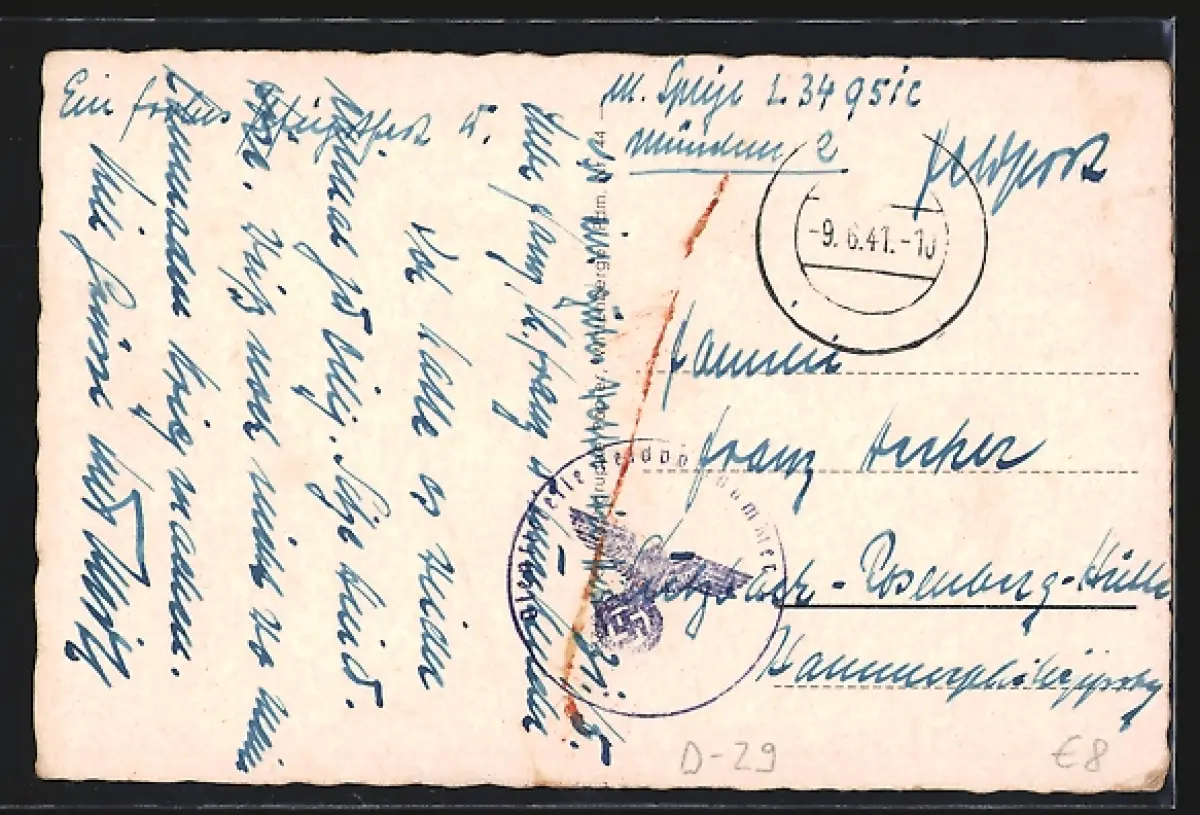 Personenbezogene Daten auf der Rückseite der Karte wurden durch blauen Textmarker unkenntlich gemacht. Die blauen Stellen sind auf die Vorderseite durchgeweicht und wirken sich negativ auf das Postkartenfoto aus