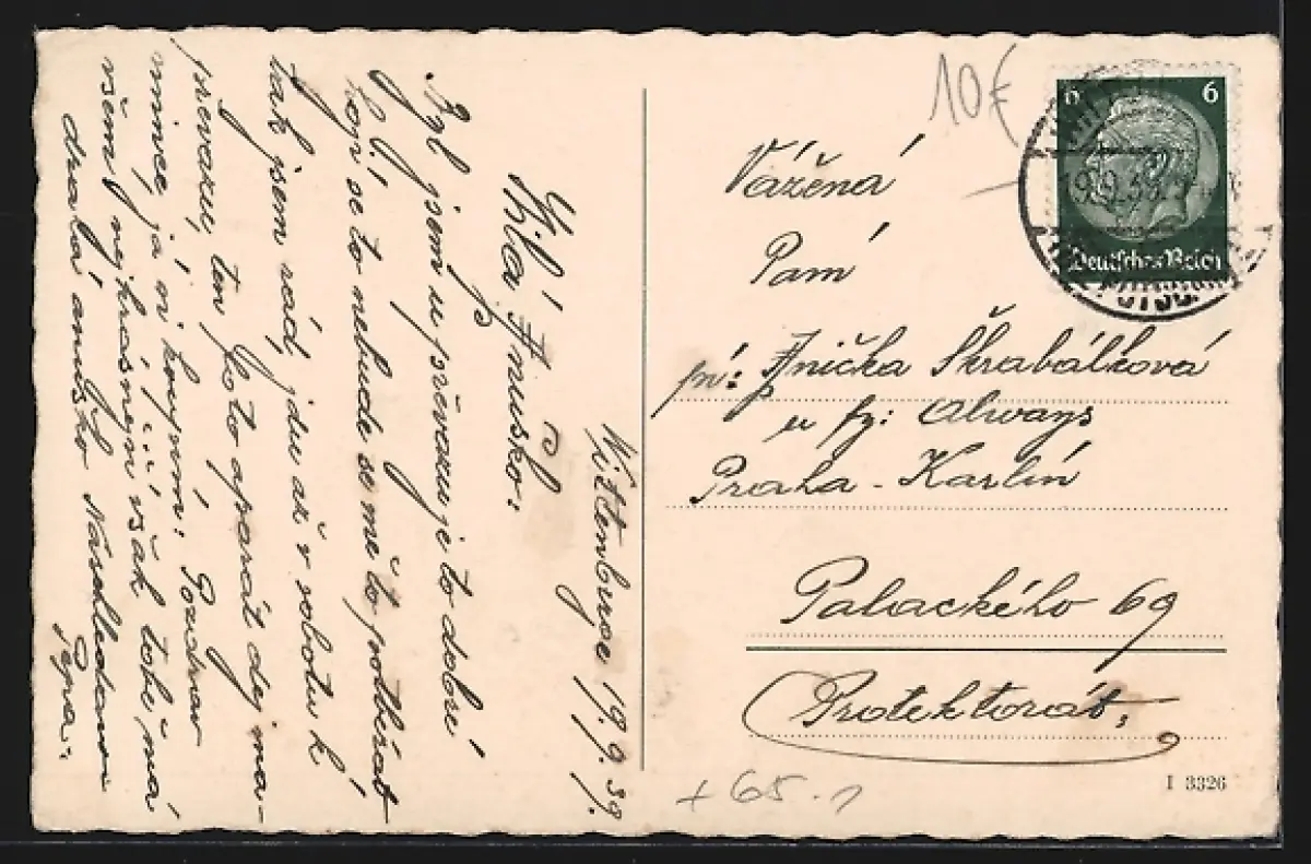 Personenbezogene Daten auf der Rückseite der Karte wurden durch blauen Textmarker unkenntlich gemacht. Die blauen Stellen sind auf die Vorderseite durchgeweicht und wirken sich negativ auf das Postkartenfoto aus