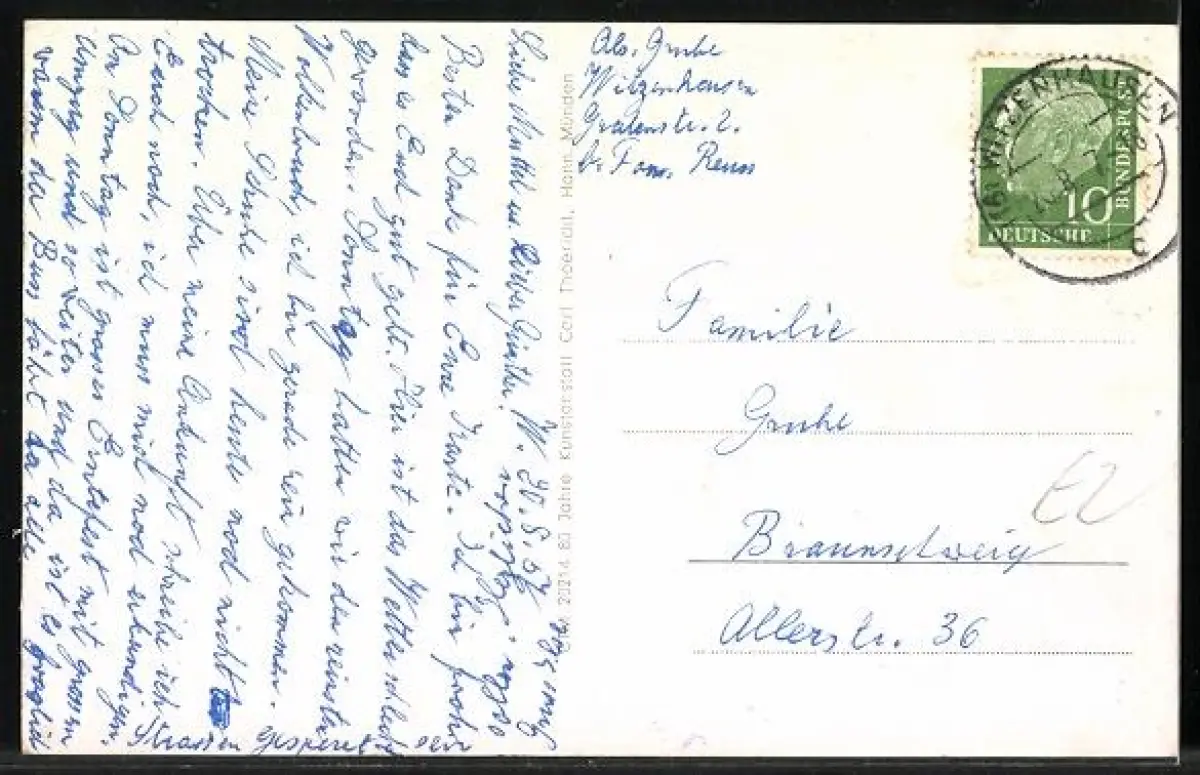 Personenbezogene Daten auf der Rückseite der Karte wurden durch blauen Textmarker unkenntlich gemacht. Die blauen Stellen sind auf die Vorderseite durchgeweicht und wirken sich negativ auf das Postkartenfoto aus