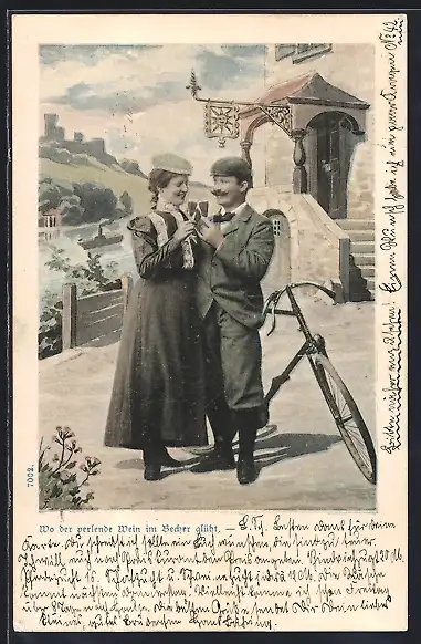 AK Wo der Wein im Becher glüht, Fahrradfahrer und Frau prosten sich zu