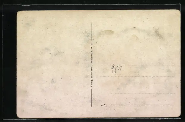 Personenbezogene Daten auf der Rückseite der Karte wurden durch blauen Textmarker unkenntlich gemacht. Die blauen Stellen sind auf die Vorderseite durchgeweicht und wirken sich negativ auf das Postkartenfoto aus