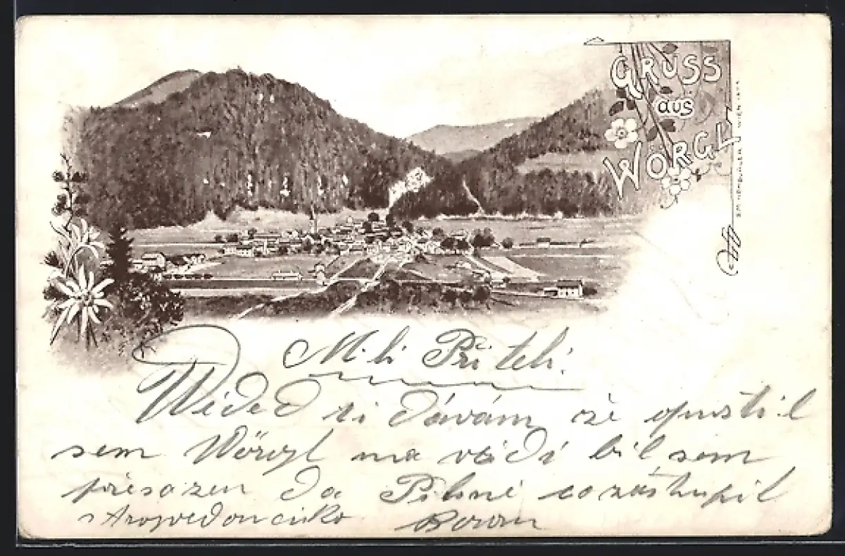 AK Wörgl, Panorama mit Gebirgshintergrund