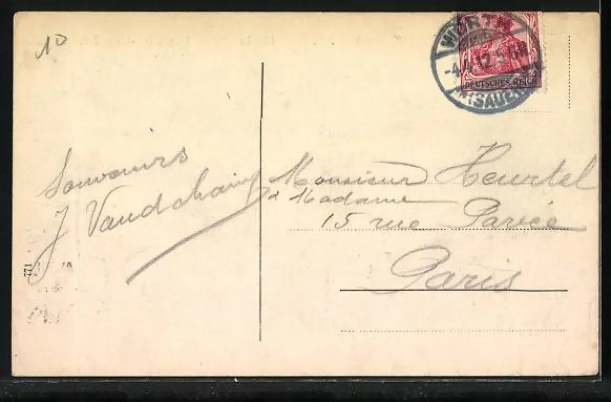 alte Ansichtskarte, gelaufen 1912, Bugspur re. senkrecht, guter Zustand