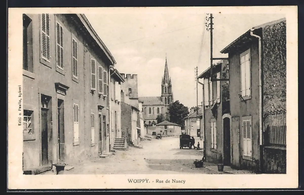 AK Woippy, Rue de Nancy avec vue sur l`église et bâtiments environnants