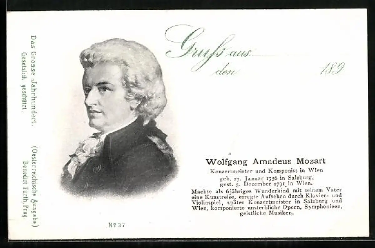 AK Wolfgang Amadeus Mozart, Porträt des Komponisten mit Lebensdaten