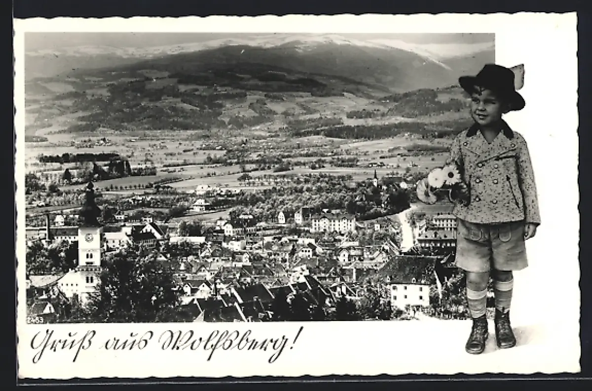 AK Wolfsberg /Kärnten, Totalansicht gegen die Berge, Knabe in Tracht
