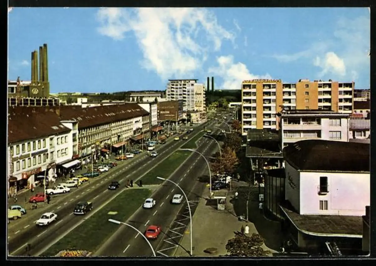 AK Wolfsburg, Porschestrasse aus der Vogelschau, mit VW-Werk
