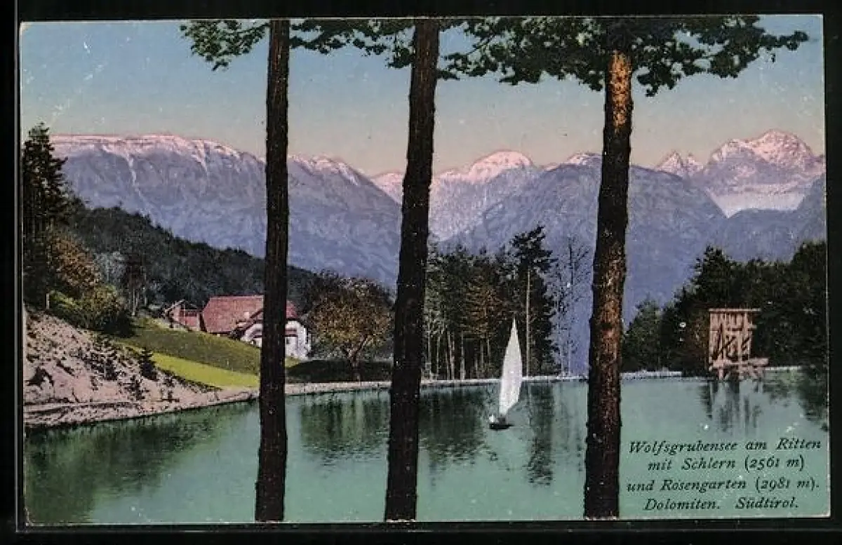 AK Wolfsgruben am Ritten, Wolfsgrubensee mit Schlern und Rosengarten