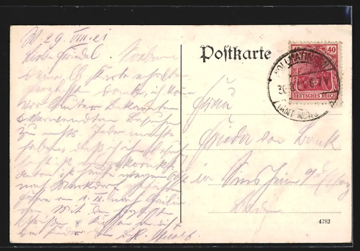 Personenbezogene Daten auf der Rückseite der Karte wurden durch blauen Textmarker unkenntlich gemacht. Die blauen Stellen sind auf die Vorderseite durchgeweicht und wirken sich negativ auf das Postkartenfoto aus