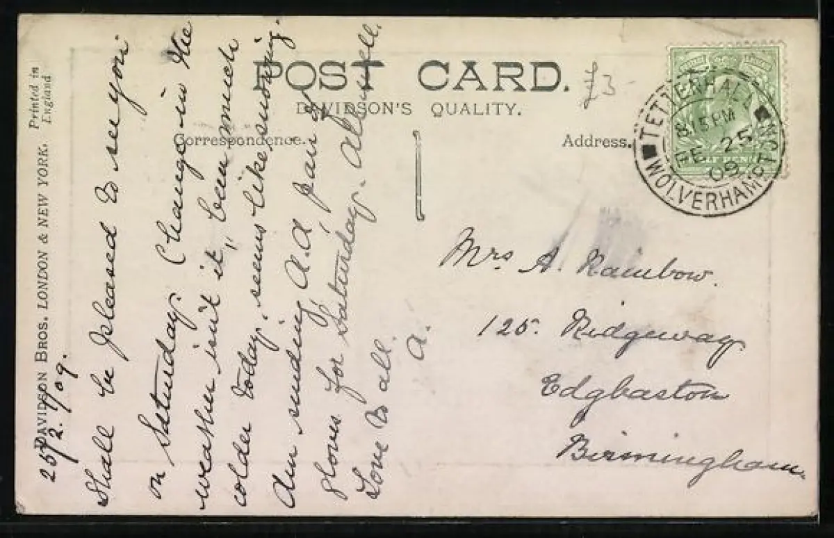 alte Ansichtskarte, gelaufen 1909, Bugspur li. oben, minimaler Einriss li. oben, guter Zustand