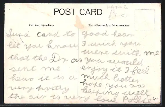 Personenbezogene Daten auf der Rückseite der Karte wurden durch blauen Textmarker unkenntlich gemacht. Die blauen Stellen sind auf die Vorderseite durchgeweicht und wirken sich negativ auf das Postkartenfoto aus