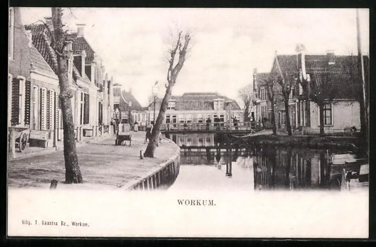 AK Workum, Ortspartie mit Brücke und Uferstrasse