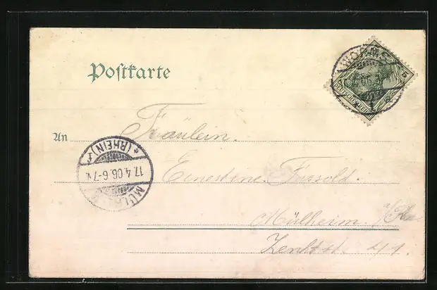 alte Ansichtskarte, gelaufen 1906, Eckknicke unten, guter Zustand