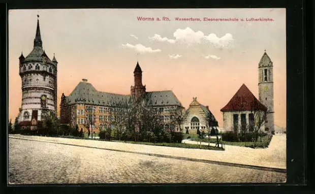 AK Worms a. Rh., Wasserturm, Eleonorenschule und Lutherkirche