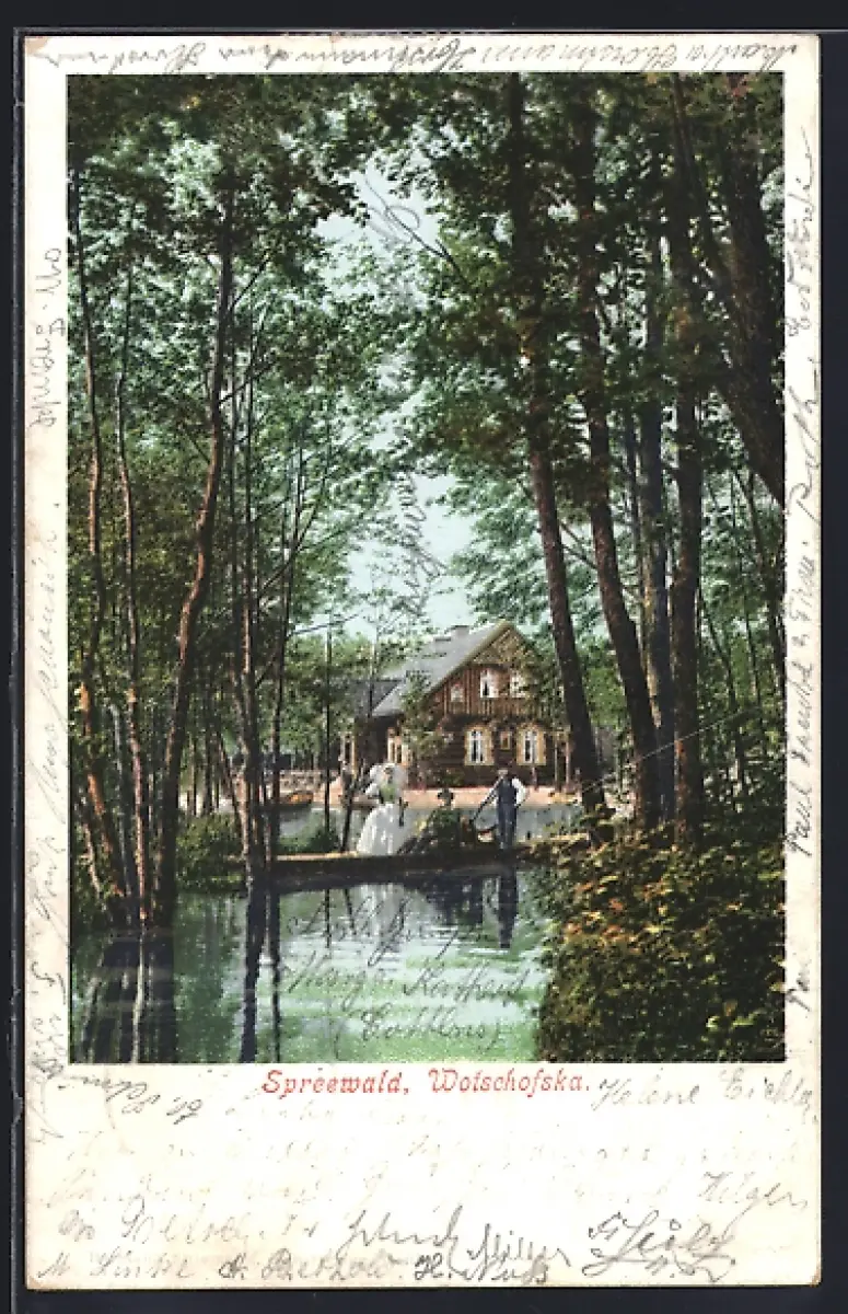 AK Wotschofska /Spreewald, Gasthaus Wotschofska, Kahn, Tracht