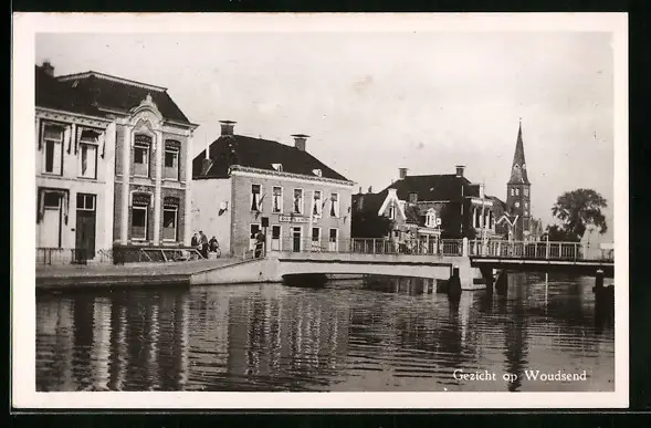 AK Woudsend, Flusspartie mit Brücke, Blick zur Kirche