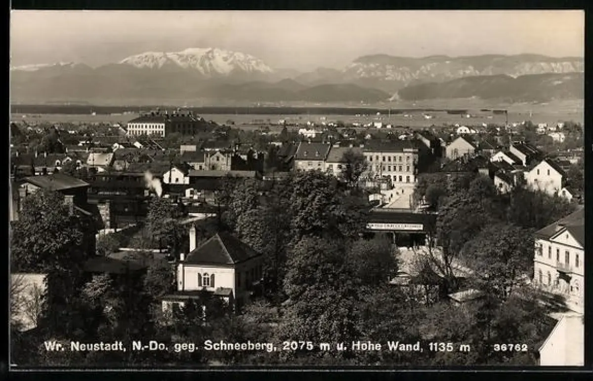 AK Wr. Neustadt, Totalansicht gegen Schneeberg u. Hohe Wand