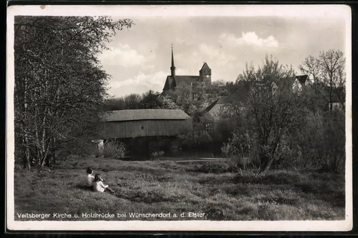 AK Wünschendorf a. d. Elster, Veitsberger Kirche, Holzbrücke