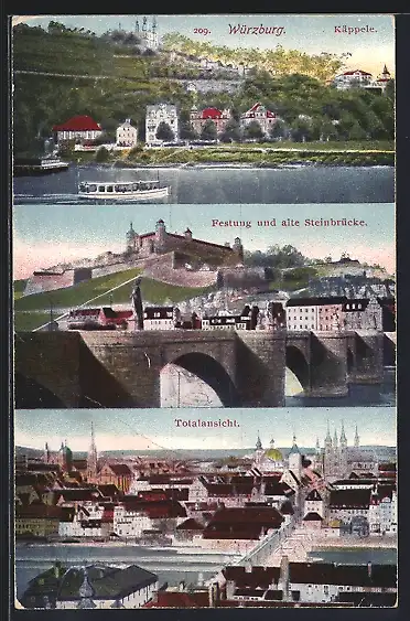 AK Würzburg, Käpelle, Festung und alte Steinbrücke, Totalansicht