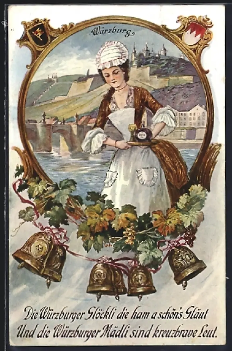 AK Würzburg, Mädchen in Trachten mit Wein, Glocken, Gedicht, Ortsansicht