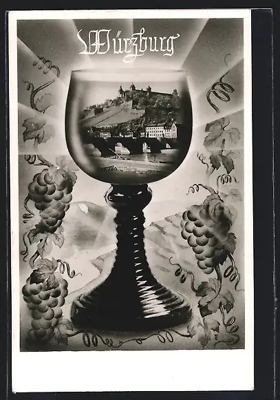 AK Würzburg a. M., Weinglas mit Stadtansicht
