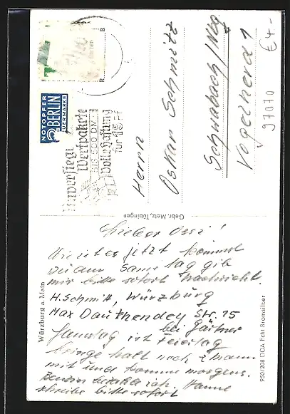 Personenbezogene Daten auf der Rückseite der Karte wurden durch blauen Textmarker unkenntlich gemacht. Die blauen Stellen sind auf die Vorderseite durchgeweicht und wirken sich negativ auf das Postkartenfoto aus