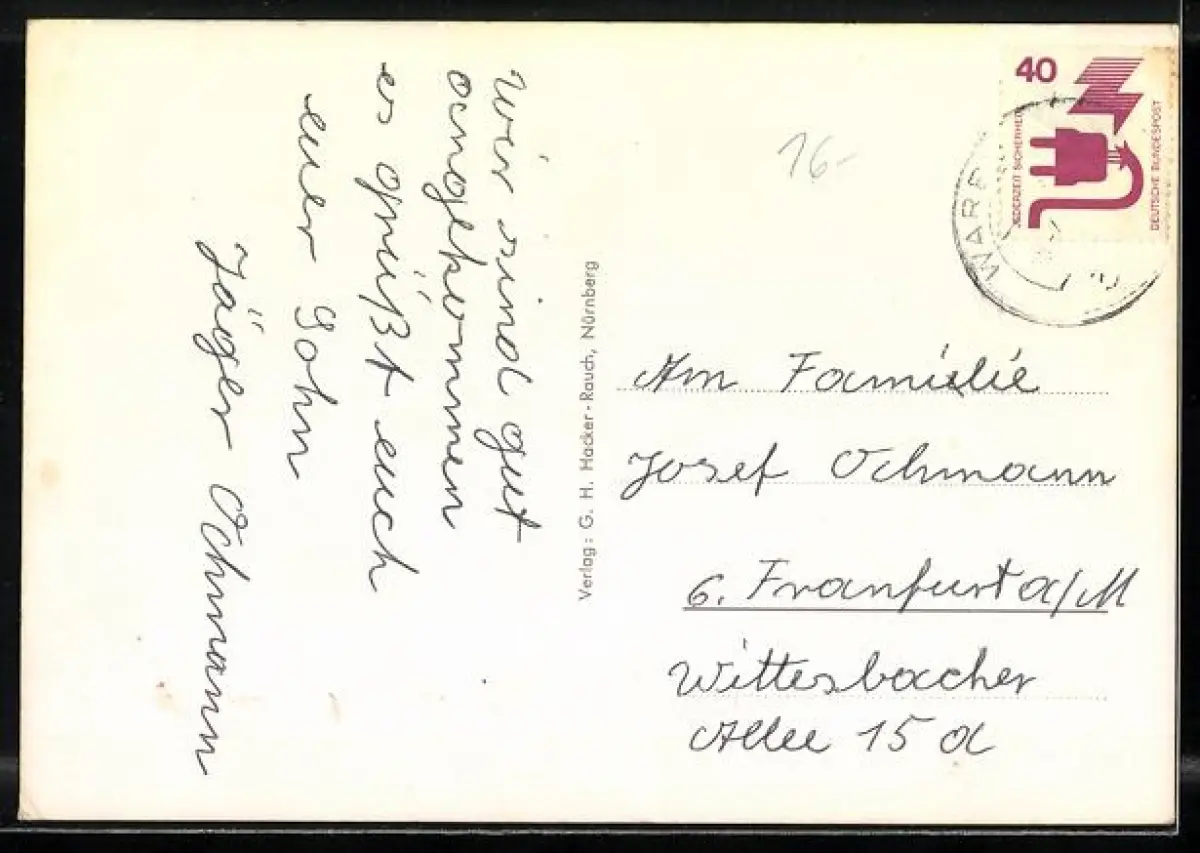 Personenbezogene Daten auf der Rückseite der Karte wurden durch blauen Textmarker unkenntlich gemacht. Die blauen Stellen sind auf die Vorderseite durchgeweicht und wirken sich negativ auf das Postkartenfoto aus