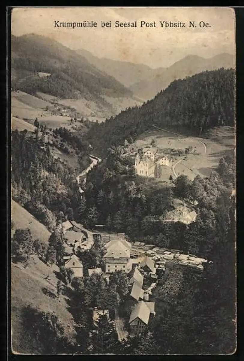 AK Ybbsitz /N.-Oe., Ortsansicht mit Gasthaus Krumpmühle, Seesal aus der Vogelschau