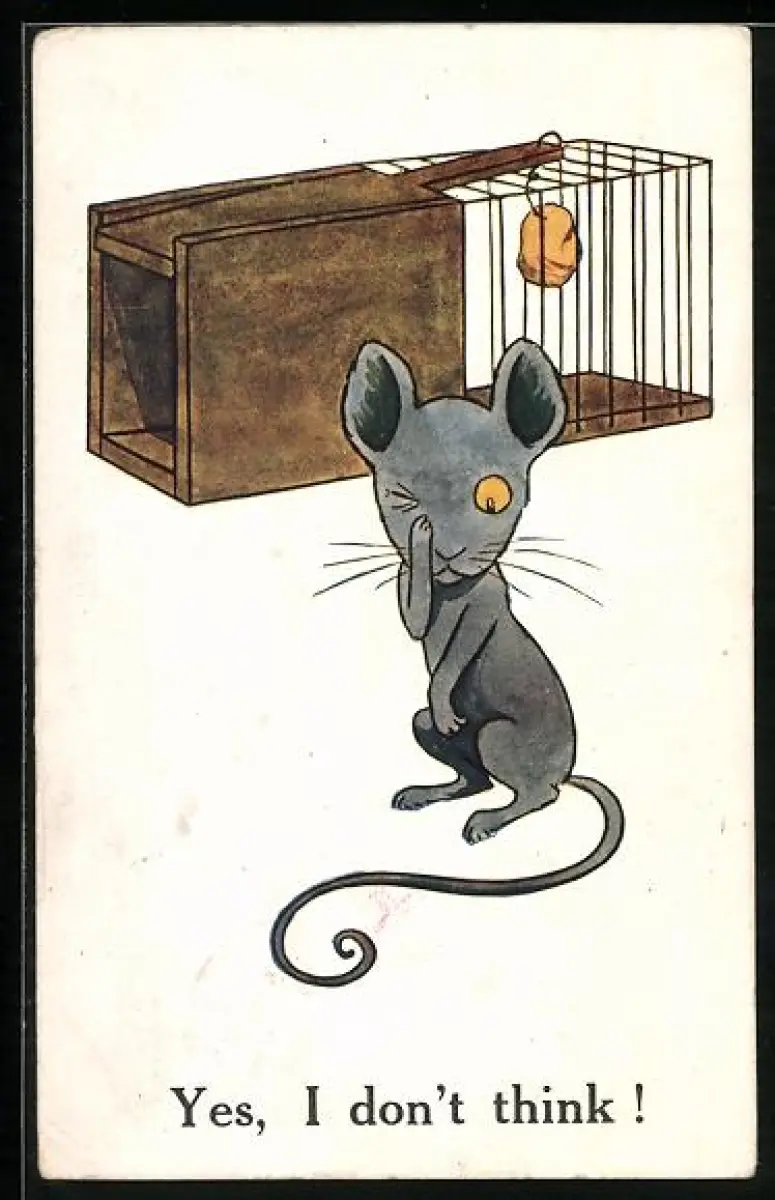 AK Yes, I don`t think!, Maus zwinkert vor der Mausefalle